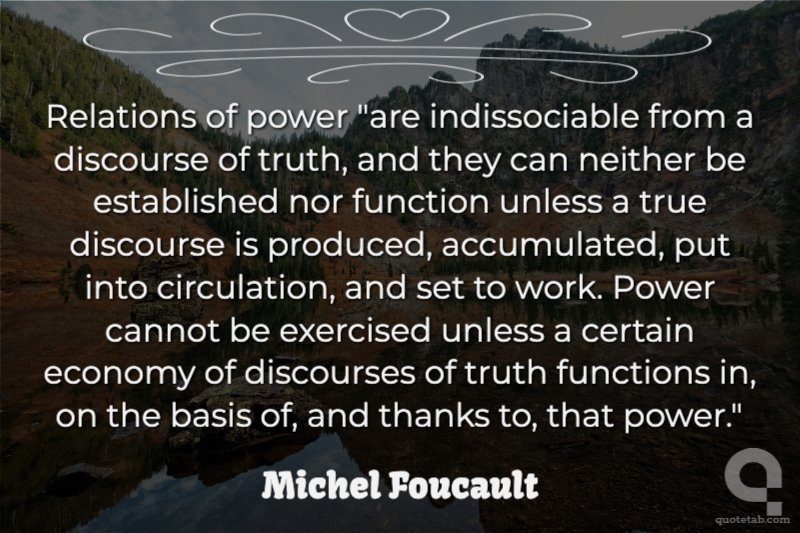 Relations of power "are indissociable from a discourse of truth, and they can neither be established nor function unless a true discourse is produced, accumulated, put into circulation, and set to work. Power cannot be exercised unless a certain economy of discourses of truth functions in, on the basis of, and thanks to, that power." Michel Foucault