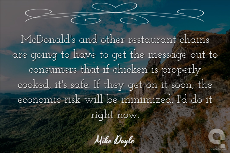 McDonald's and other restaurant chains are going to have to get the message out to consumers that if chicken is properly cooked, it's safe. If they get on it soon, the economic risk will be minimized. I'd do it right now. Mike Doyle