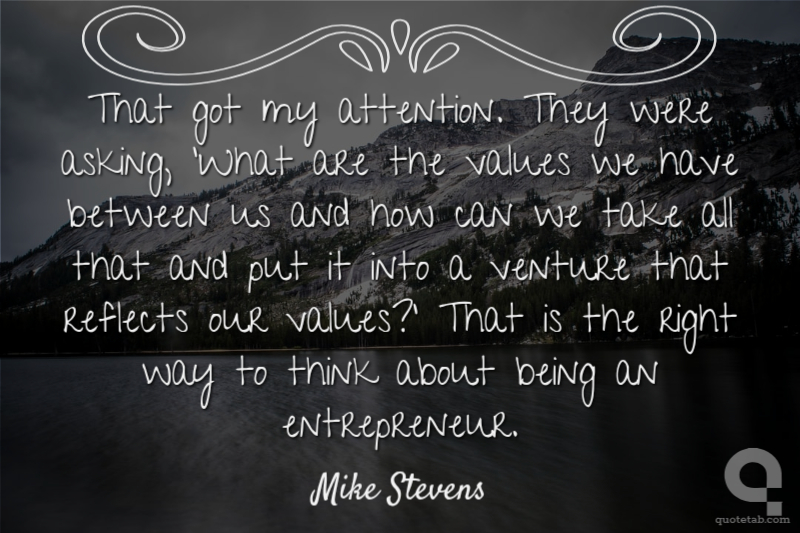 That got my attention. They were asking, 'What are the values we have between us and how can we take all that and put it into a venture that reflects our values?' That is the right way to think about being an entrepreneur. Mike Stevens