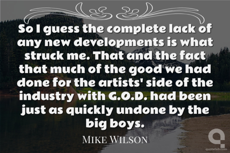 So I guess the complete lack of any new developments is what struck me. That and the fact that much of the good we had done for the artists' side of the industry with G.O.D. had been just as quickly undone by the big boys. Mike Wilson
