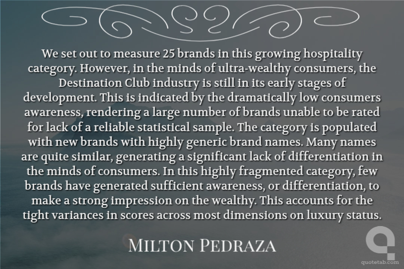 We set out to measure 25 brands in this growing hospitality category. However, in the minds of ultra-wealthy consumers, the Destination Club industry is still in its early stages of development. This is indicated by the dramatically low consumers awareness, rendering a large number of brands unable to be rated for lack of a reliable statistical sample. The category is populated with new brands with highly generic brand names. Many names are quite similar, generating a significant lack of differentiation in the minds of consumers. In this highly fragmented category, few brands have generated sufficient awareness, or differentiation, to make a strong impression on the wealthy. This accounts for the tight variances in scores across most dimensions on luxury status. Milton Pedraza