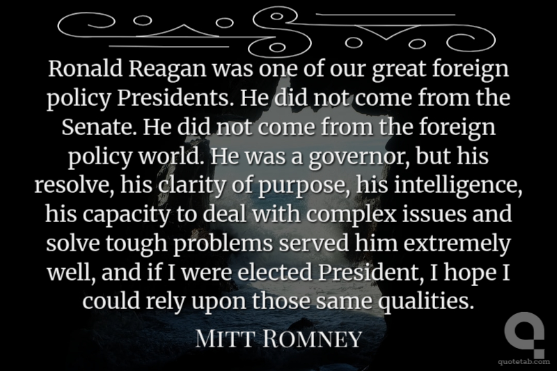 Ronald Reagan was one of our great foreign policy Presidents. He did not come from the Senate. He did not come from the foreign policy world. He was a governor, but his resolve, his clarity of purpose, his intelligence, his capacity to deal with complex issues and solve tough problems served him extremely well, and if I were elected President, I hope I could rely upon those same qualities. Mitt Romney