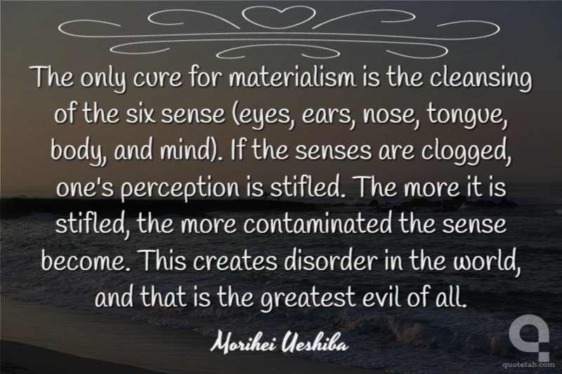 The only cure for materialism is the cleansing of the six sense (eyes, ears, nose, tongue, body, and mind). If the senses are clogged, one's perception is stifled. The more it is stifled, the more contaminated the sense become. This creates disorder in the world, and that is the greatest evil of all. Morihei Ueshiba