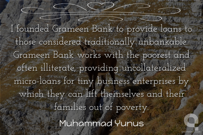 I founded Grameen Bank to provide loans to those considered traditionally unbankable. Grameen Bank works with the poorest and often illiterate, providing uncollateralized micro-loans for tiny business enterprises by which they can lift themselves and their families out of poverty. Muhammad Yunus