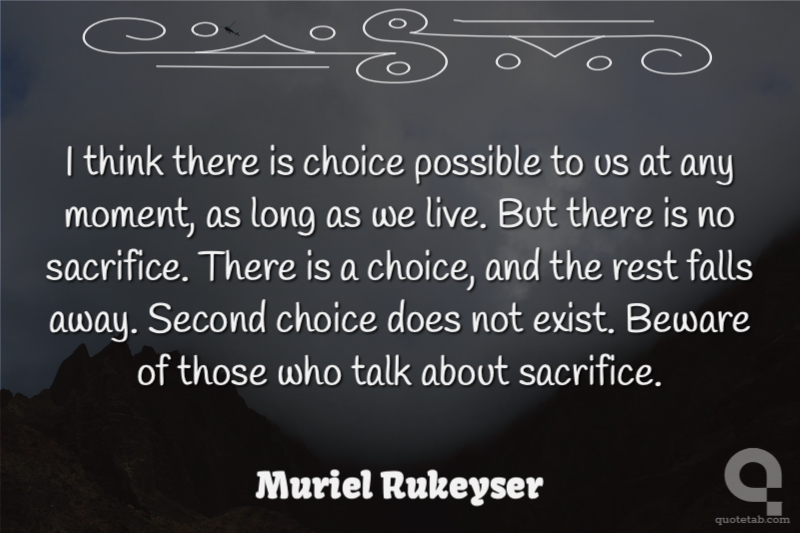 I think there is choice possible to us at any moment, as long as we live. But there is no sacrifice. There is a choice, and the rest falls away. Second choice does not exist. Beware of those who talk about sacrifice. Muriel Rukeyser