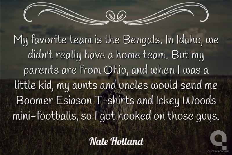 My favorite team is the Bengals. In Idaho, we didn't really have a home team. But my parents are from Ohio, and when I was a little kid, my aunts and uncles would send me Boomer Esiason T-shirts and Ickey Woods mini-footballs, so I got hooked on those guys. Nate Holland