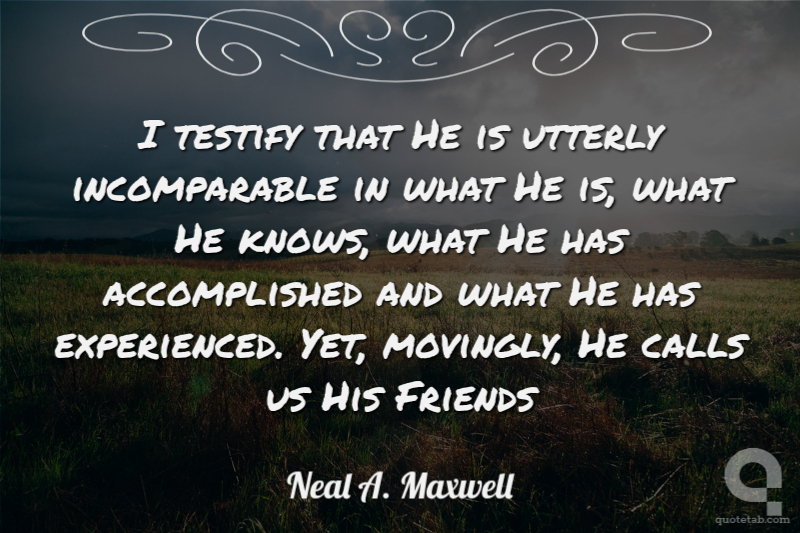 I testify that He is utterly incomparable in what He is, what He knows, what He has accomplished and what He has experienced. Yet, movingly, He calls us His Friends Neal A. Maxwell