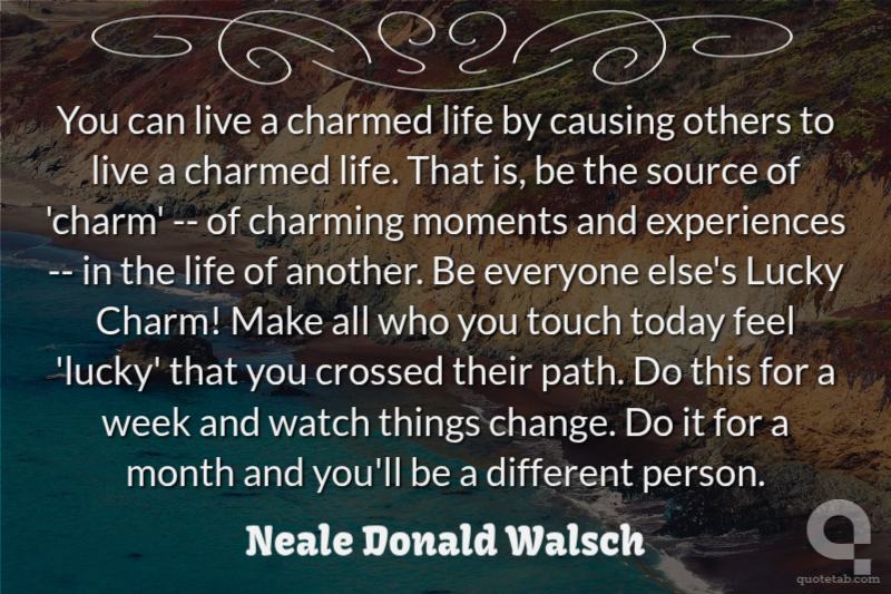 You can live a charmed life by causing others to live a charmed life. That is, be the source of 'charm' -- of charming moments and experiences -- in the life of another. Be everyone else's Lucky Charm! Make all who you touch today feel 'lucky' that you crossed their path. Do this for a week and watch things change. Do it for a month and you'll be a different person. Neale Donald Walsch