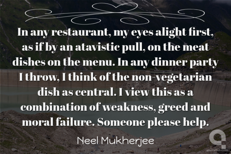 In any restaurant, my eyes alight first, as if by an atavistic pull, on the meat dishes on the menu. In any dinner party I throw, I think of the non-vegetarian dish as central. I view this as a combination of weakness, greed and moral failure. Someone please help. Neel Mukherjee