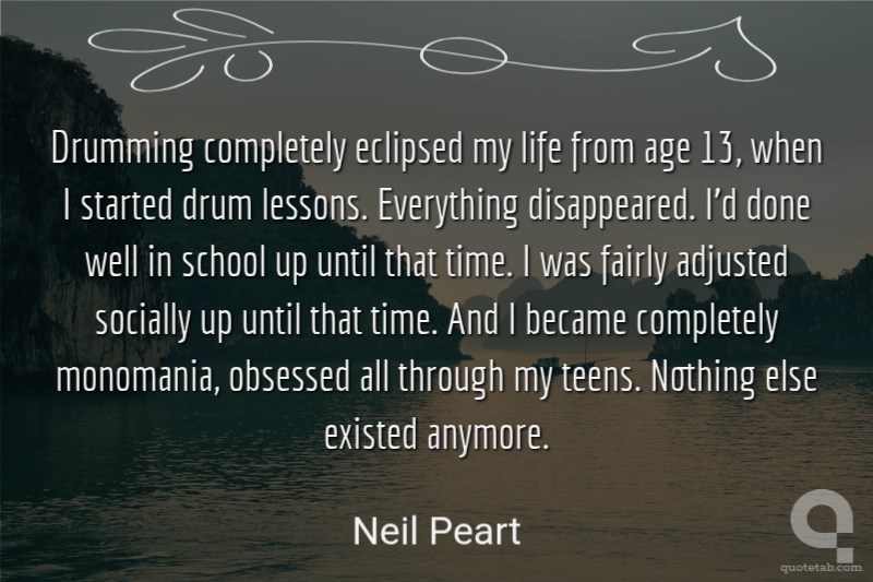 Drumming completely eclipsed my life from age 13, when I started drum lessons. Everything disappeared. I'd done well in school up until that time. I was fairly adjusted socially up until that time. And I became completely monomania, obsessed all through my teens. Nothing else existed anymore. Neil Peart