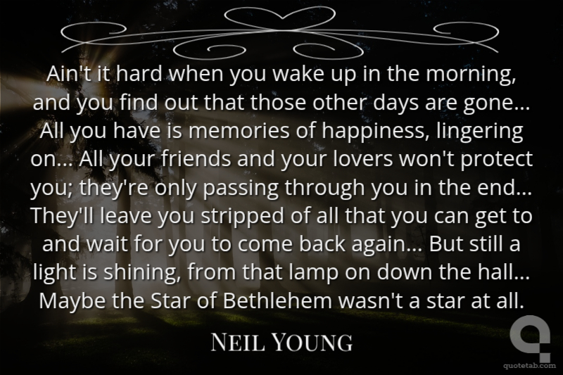 Ain't it hard when you wake up in the morning, and you find out that those other days are gone... All you have is memories of happiness, lingering on... All your friends and your lovers won't protect you; they're only passing through you in the end... They'll leave you stripped of all that you can get to and wait for you to come back again... But still a light is shining, from that lamp on down the hall... Maybe the Star of Bethlehem wasn't a star at all. Neil Young