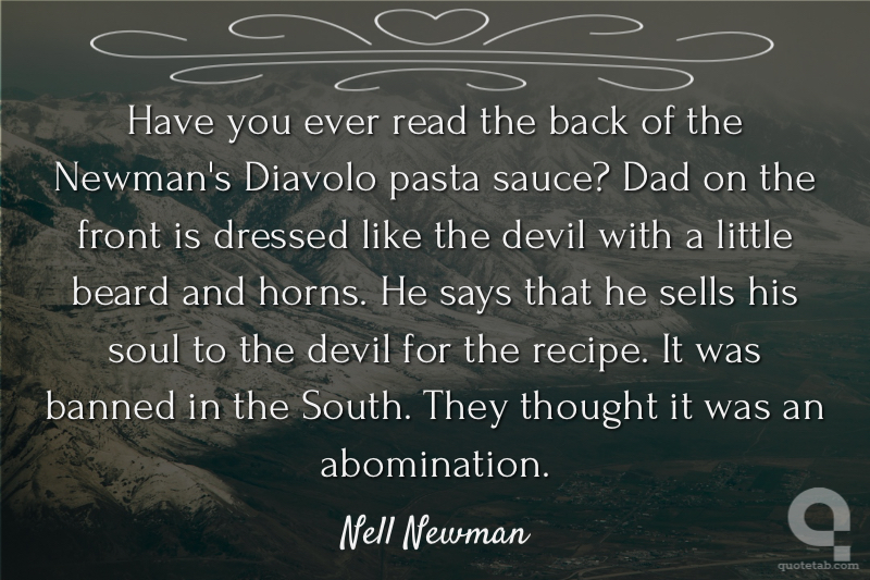 Have you ever read the back of the Newman's Diavolo pasta sauce? Dad on the front is dressed like the devil with a little beard and horns. He says that he sells his soul to the devil for the recipe. It was banned in the South. They thought it was an abomination. Nell Newman