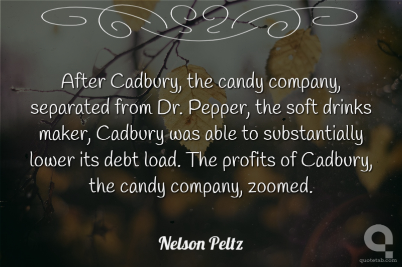 After Cadbury, the candy company, separated from Dr. Pepper, the soft drinks maker, Cadbury was able to substantially lower its debt load. The profits of Cadbury, the candy company, zoomed. Nelson Peltz