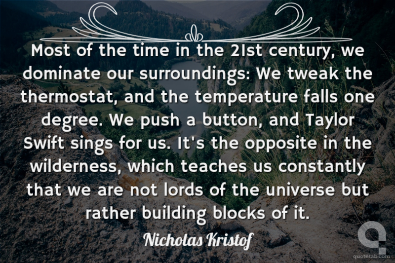 Most of the time in the 21st century, we dominate our surroundings: We tweak the thermostat, and the temperature falls one degree. We push a button, and Taylor Swift sings for us. It's the opposite in the wilderness, which teaches us constantly that we are not lords of the universe but rather building blocks of it. Nicholas Kristof