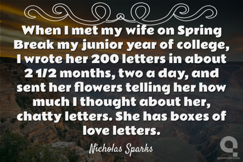 When I met my wife on Spring Break my junior year of college, I wrote her 200 letters in about 2 1/2 months, two a day, and sent her flowers telling her how much I thought about her, chatty letters. She has boxes of love letters. Nicholas Sparks