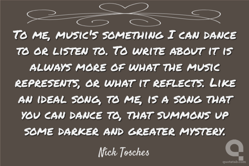 To me, music's something I can dance to or listen to. To write about it is always more of what the music represents, or what it reflects. Like an ideal song, to me, is a song that you can dance to, that summons up some darker and greater mystery. Nick Tosches