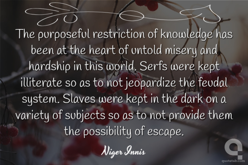 The purposeful restriction of knowledge has been at the heart of untold misery and hardship in this world. Serfs were kept illiterate so as to not jeopardize the feudal system. Slaves were kept in the dark on a variety of subjects so as to not provide them the possibility of escape. Niger Innis