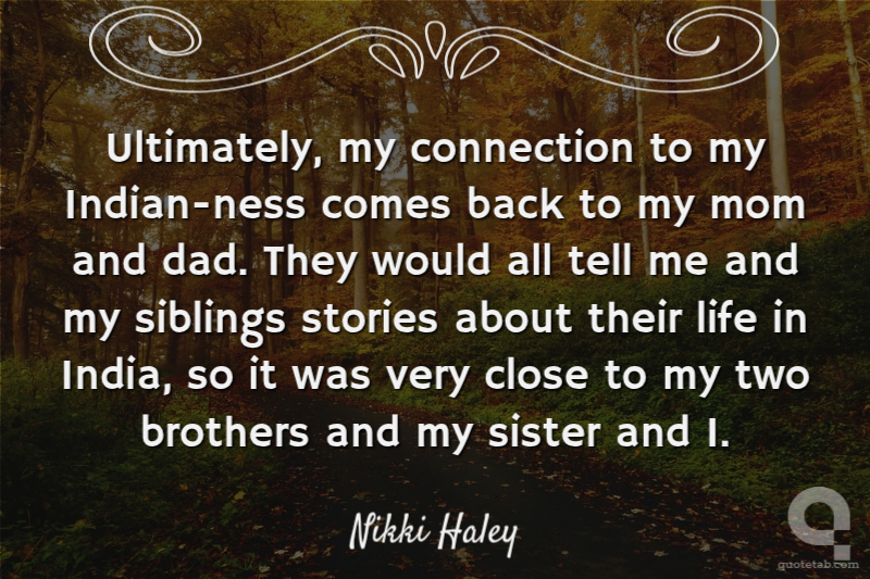 Ultimately, my connection to my Indian-ness comes back to my mom and dad. They would all tell me and my siblings stories about their life in India, so it was very close to my two brothers and my sister and I. Nikki Haley