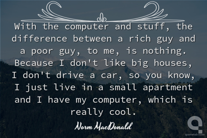 With the computer and stuff, the difference between a rich guy and a poor guy, to me, is nothing. Because I don't like big houses, I don't drive a car, so you know, I just live in a small apartment and I have my computer, which is really cool. Norm MacDonald