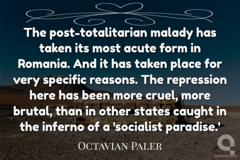 The post-totalitarian malady has taken its most acute form in Romania. And it has taken place for very specific reasons. The repression here has been more cruel, more brutal, than in other states caught in the inferno of a 'socialist paradise.' Octavian Paler