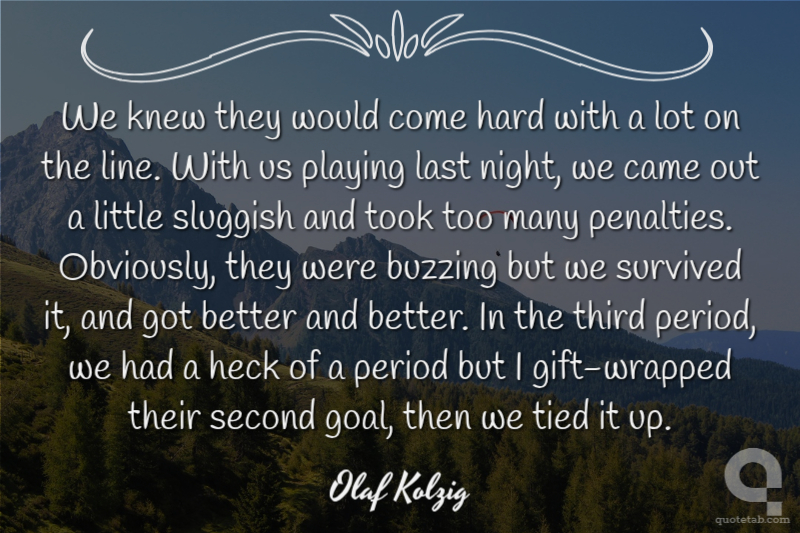 We knew they would come hard with a lot on the line. With us playing last night, we came out a little sluggish and took too many penalties. Obviously, they were buzzing but we survived it, and got better and better. In the third period, we had a heck of a period but I gift-wrapped their second goal, then we tied it up. Olaf Kolzig