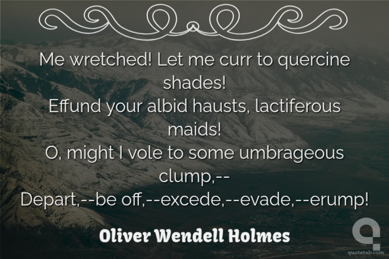 Me wretched! Let me curr to quercine shades! Effund your albid hausts, lactiferous maids! O, might I vole to some umbrageous clump,-- Depart,--be off,--excede,--evade,--erump! Oliver Wendell Holmes