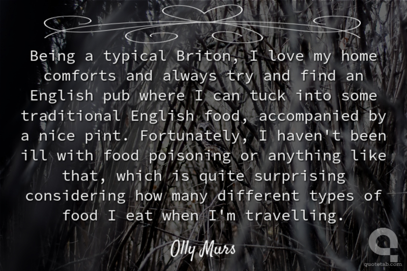 Being a typical Briton, I love my home comforts and always try and find an English pub where I can tuck into some traditional English food, accompanied by a nice pint. Fortunately, I haven't been ill with food poisoning or anything like that, which is quite surprising considering how many different types of food I eat when I'm travelling. Olly Murs