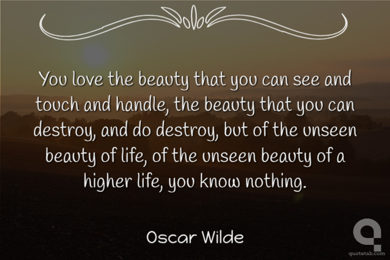 You love the beauty that you can see and touch and handle, the beauty that you can destroy, and do destroy, but of the unseen beauty of life, of the unseen beauty of a higher life, you know nothing. Oscar Wilde