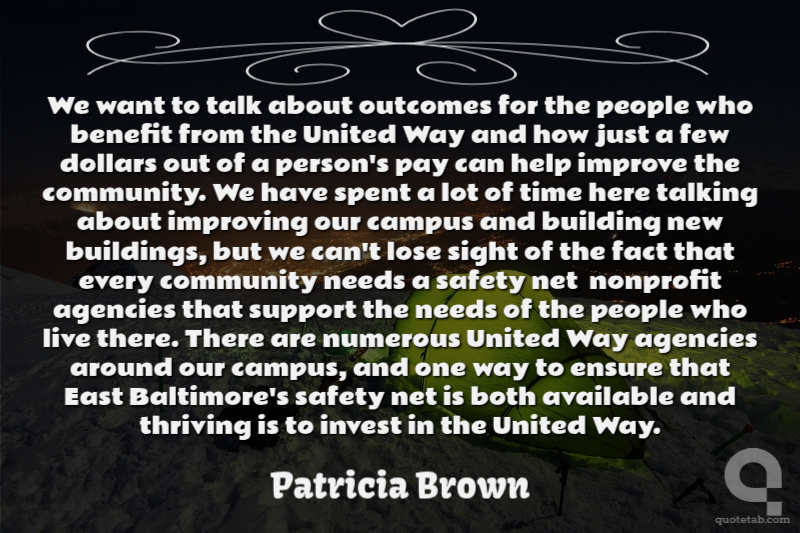 We want to talk about outcomes for the people who benefit from the United Way and how just a few dollars out of a person's pay can help improve the community. We have spent a lot of time here talking about improving our campus and building new buildings, but we can't lose sight of the fact that every community needs a safety net nonprofit agencies that support the needs of the people who live there. There are numerous United Way agencies around our campus, and one way to ensure that East Baltimore's safety net is both available and thriving is to invest in the United Way. Patricia Brown