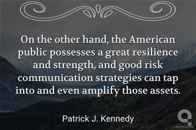 On the other hand, the American public possesses a great resilience and strength, and good risk communication strategies can tap into and even amplify those assets. Patrick J. Kennedy