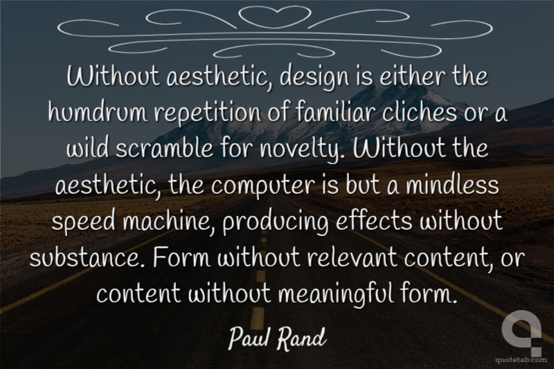 Without aesthetic, design is either the humdrum repetition of familiar cliches or a wild scramble for novelty. Without the aesthetic, the computer is but a mindless speed machine, producing effects without substance. Form without relevant content, or content without meaningful form. Paul Rand