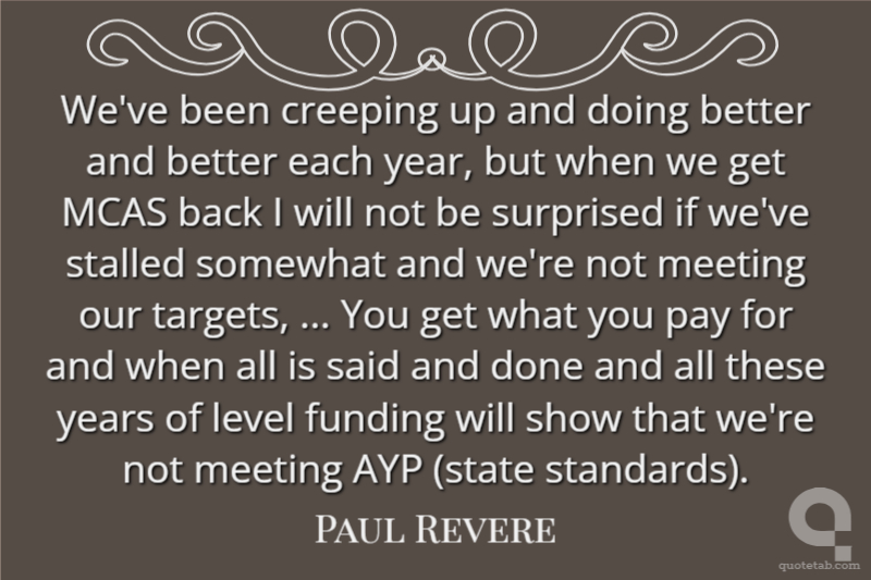 We've been creeping up and doing better and better each year, but when we get MCAS back I will not be surprised if we've stalled somewhat and we're not meeting our targets, ... You get what you pay for and when all is said and done and all these years of level funding will show that we're not meeting AYP (state standards). Paul Revere