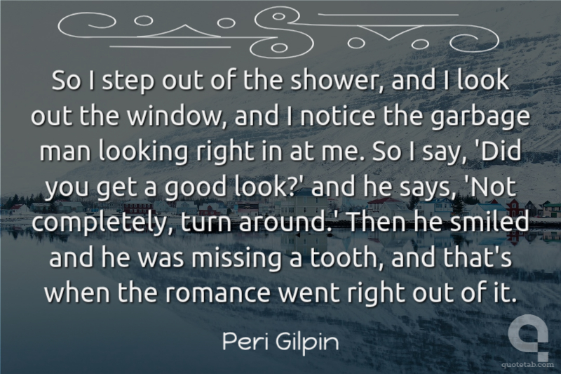 So I step out of the shower, and I look out the window, and I notice the garbage man looking right in at me. So I say, 'Did you get a good look?' and he says, 'Not completely, turn around.' Then he smiled and he was missing a tooth, and that's when the romance went right out of it. Peri Gilpin