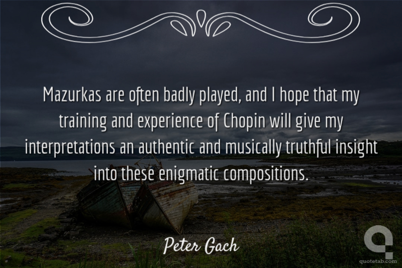 Mazurkas are often badly played, and I hope that my training and experience of Chopin will give my interpretations an authentic and musically truthful insight into these enigmatic compositions. Peter Gach