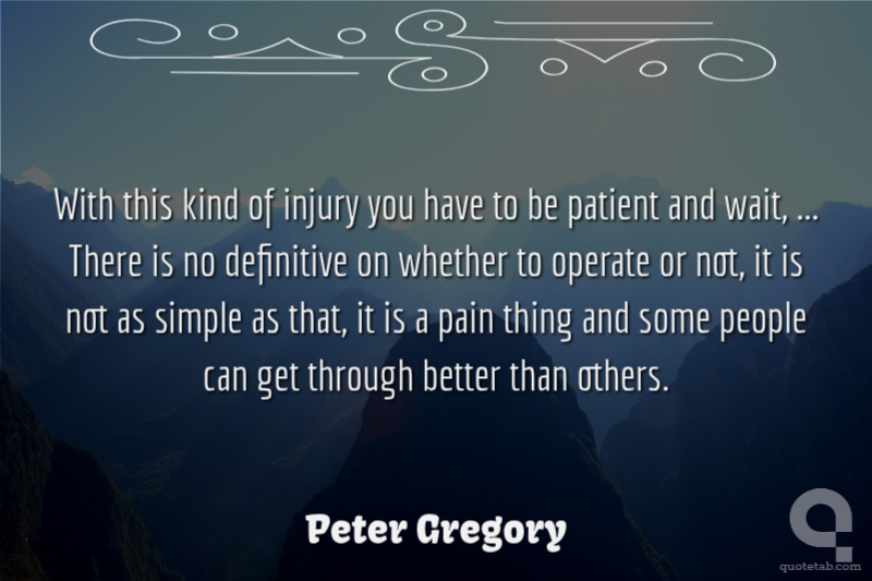 With this kind of injury you have to be patient and wait, ... There is no definitive on whether to operate or not, it is not as simple as that, it is a pain thing and some people can get through better than others. Peter Gregory