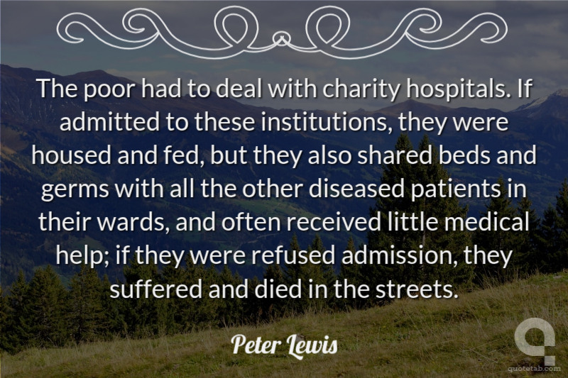 The poor had to deal with charity hospitals. If admitted to these institutions, they were housed and fed, but they also shared beds and germs with all the other diseased patients in their wards, and often received little medical help; if they were refused admission, they suffered and died in the streets. Peter Lewis