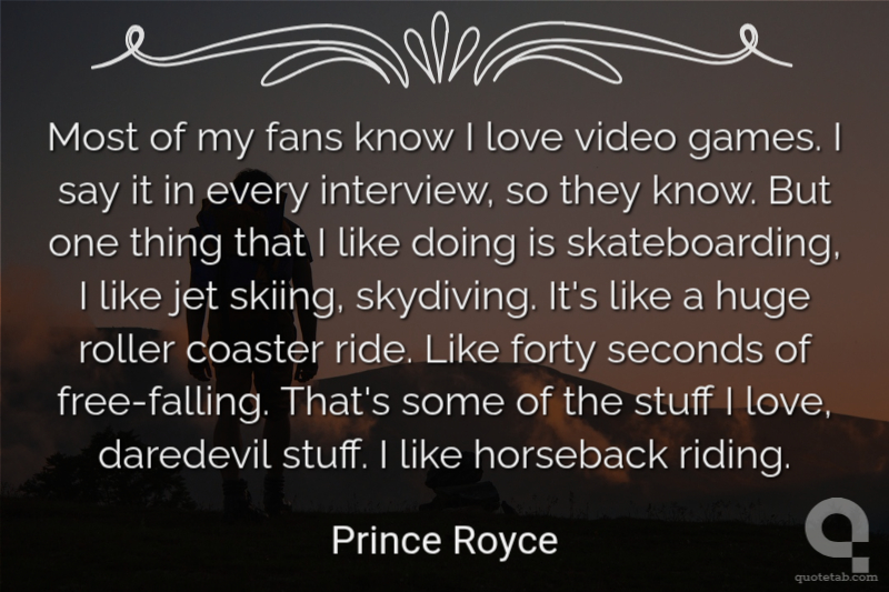 Most of my fans know I love video games. I say it in every interview, so they know. But one thing that I like doing is skateboarding, I like jet skiing, skydiving. It's like a huge roller coaster ride. Like forty seconds of free-falling. That's some of the stuff I love, daredevil stuff. I like horseback riding. Prince Royce