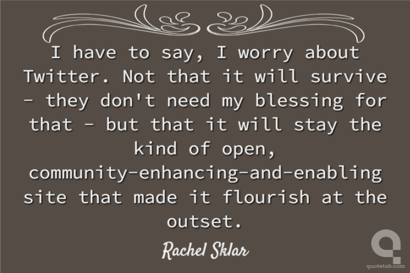 I have to say, I worry about Twitter. Not that it will survive - they don't need my blessing for that - but that it will stay the kind of open, community-enhancing-and-enabling site that made it flourish at the outset. Rachel Sklar