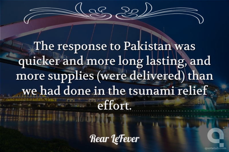 The response to Pakistan was quicker and more long lasting, and more supplies (were delivered) than we had done in the tsunami relief effort. Rear LeFever