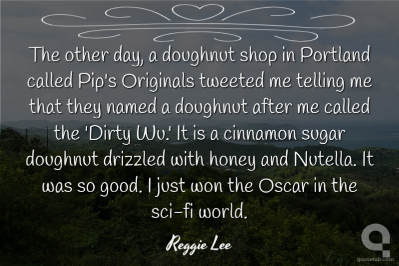 The other day, a doughnut shop in Portland called Pip's Originals tweeted me telling me that they named a doughnut after me called the 'Dirty Wu.' It is a cinnamon sugar doughnut drizzled with honey and Nutella. It was so good. I just won the Oscar in the sci-fi world. Reggie Lee