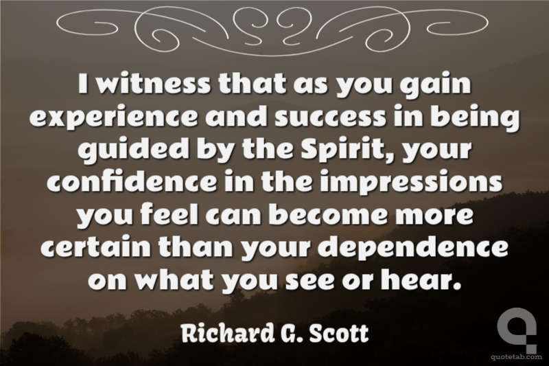 I witness that as you gain experience and success in being guided by the Spirit, your confidence in the impressions you feel can become more certain than your dependence on what you see or hear. Richard G. Scott