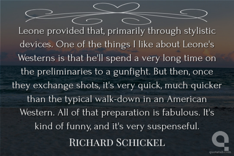 Leone provided that, primarily through stylistic devices, ... One of the things I like about Leone's Westerns is that he'll spend a very long time on the preliminaries to a gunfight. But then, once they exchange shots, it's very quick, much quicker than the typical walk-down in an American Western. All of that preparation is fabulous. It's kind of funny, and it's very suspenseful. Richard Schickel