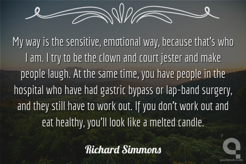 My way is the sensitive, emotional way, because that's who I am. I try to be the clown and court jester and make people laugh. At the same time, you have people in the hospital who have had gastric bypass or lap-band surgery, and they still have to work out. If you don't work out and eat healthy, you'll look like a melted candle. Richard Simmons