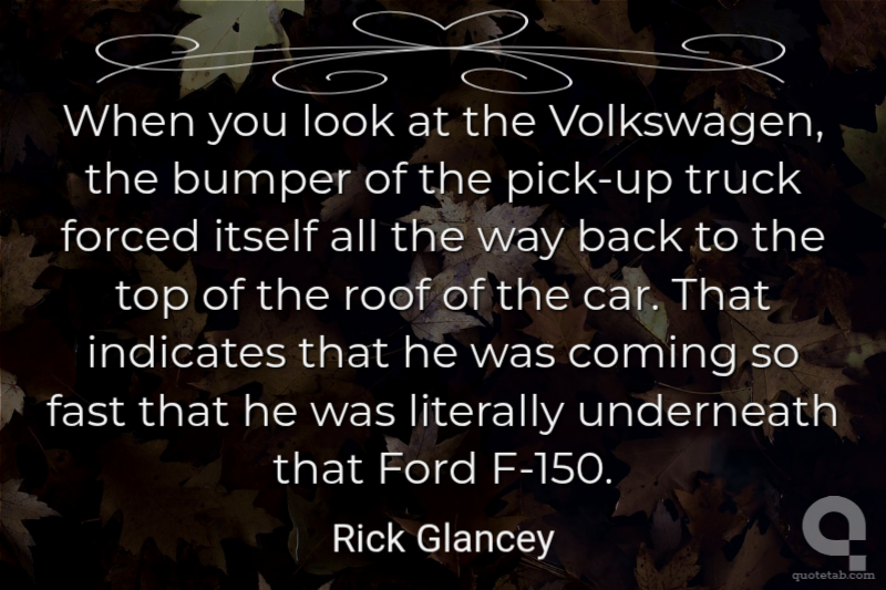 When you look at the Volkswagen, the bumper of the pick-up truck forced itself all the way back to the top of the roof of the car. That indicates that he was coming so fast that he was literally underneath that Ford F-150. Rick Glancey