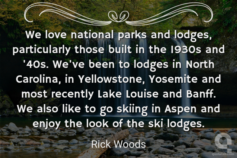 We love national parks and lodges, particularly those built in the 1930s and '40s. We've been to lodges in North Carolina, in Yellowstone, Yosemite and most recently Lake Louise and Banff. We also like to go skiing in Aspen and enjoy the look of the ski lodges. Rick Woods