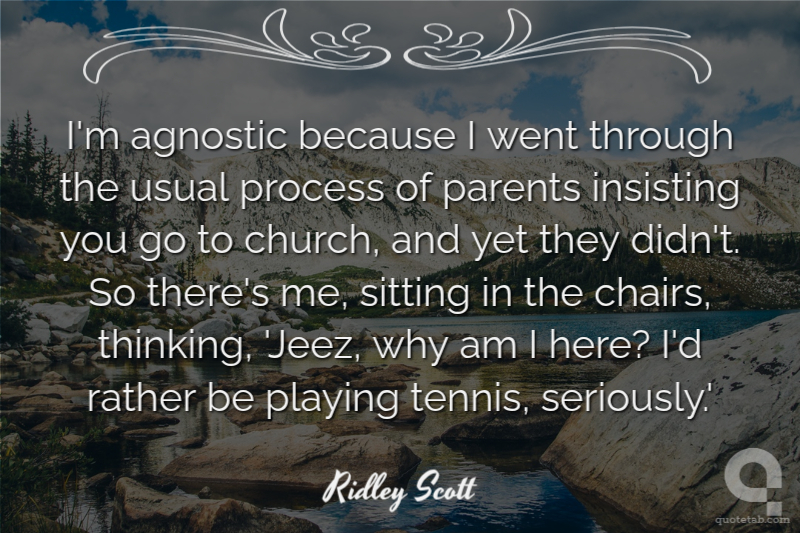 I'm agnostic because I went through the usual process of parents insisting you go to church, and yet they didn't. So there's me, sitting in the chairs, thinking, 'Jeez, why am I here? I'd rather be playing tennis, seriously.' Ridley Scott