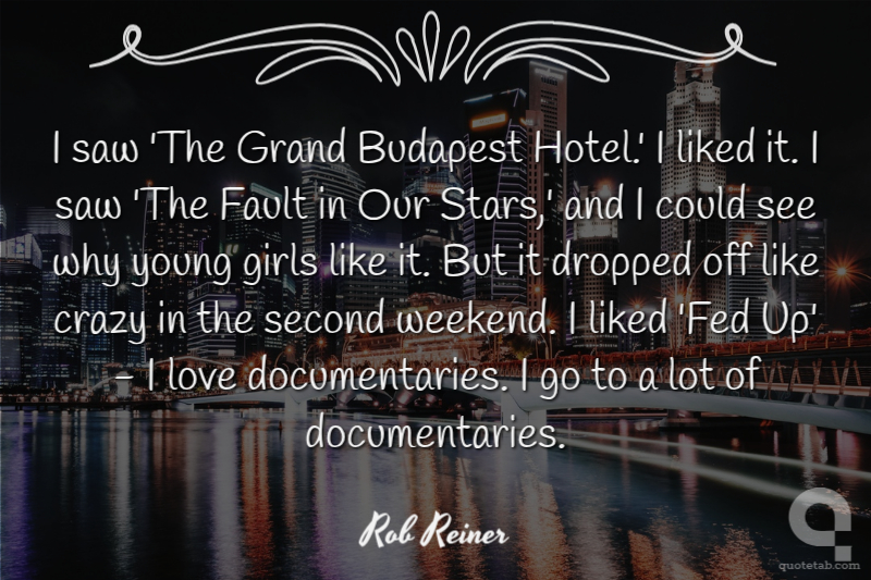 I saw 'The Grand Budapest Hotel.' I liked it. I saw 'The Fault in Our Stars,' and I could see why young girls like it. But it dropped off like crazy in the second weekend. I liked 'Fed Up' - I love documentaries. I go to a lot of documentaries. Rob Reiner