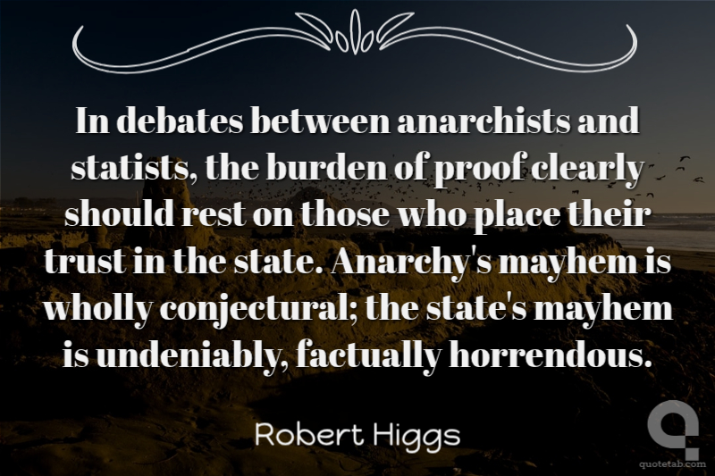 In debates between anarchists and statists, the burden of proof clearly should rest on those who place their trust in the state. Anarchy's mayhem is wholly conjectural; the state's mayhem is undeniably, factually horrendous. Robert Higgs