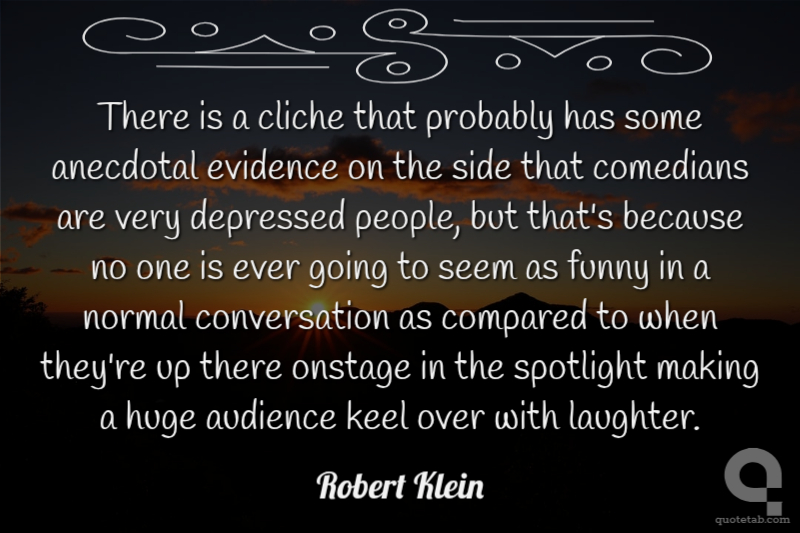 There is a cliche that probably has some anecdotal evidence on the side that comedians are very depressed people, but that's because no one is ever going to seem as funny in a normal conversation as compared to when they're up there onstage in the spotlight making a huge audience keel over with laughter. Robert Klein