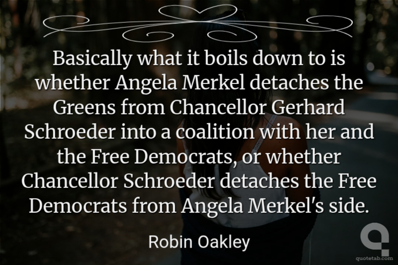 Basically what it boils down to is whether Angela Merkel detaches the Greens from Chancellor Gerhard Schroeder into a coalition with her and the Free Democrats, or whether Chancellor Schroeder detaches the Free Democrats from Angela Merkel's side. Robin Oakley